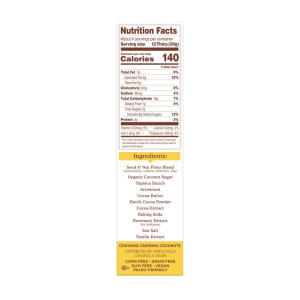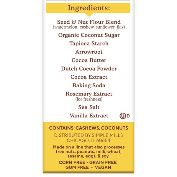 Seed & Nut Flour Blend (watermelon, cashew, sunflower, flax), Organic Coconut Sugar, Tapioca Starch, Arrowroot, Cocoa Butter, Dutch Cocoa Powder, Cocoa Extract, Baking Soda, Rosemary Extract (for freshness), Sea Salt, Vanilla Extract
