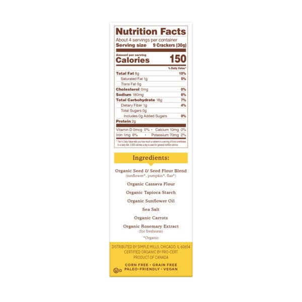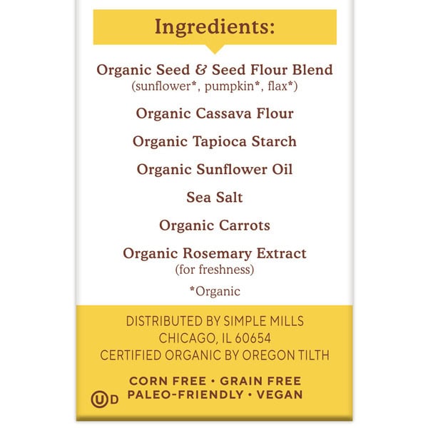 Organic Seed & Seed Flour Blend (sunflower, pumpkin, flax), Organic Cassava Flour, Organic Tapioca Starch, Organic Sunflower Oil, Sea Salt, Organic Carrots, Organic Rosemary Extract (for freshness)Â Â
