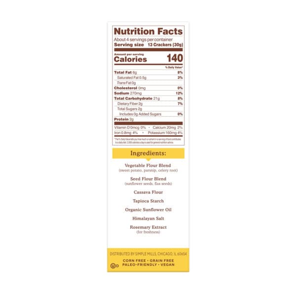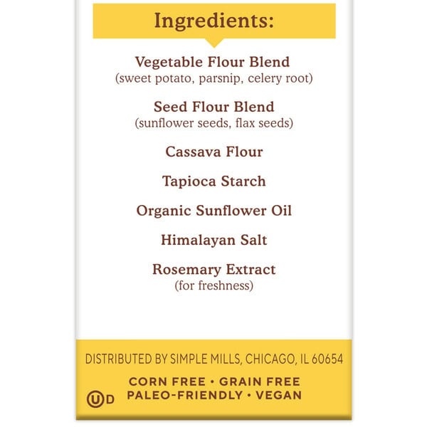 Vegetable Flour Blend (Sweet Potato, Parsnip, Celery Root), Seed Flour Blend (Sunflower Seeds, Flax Seeds), Cassava Flour, Tapioca Starch, Organic Sunflower Oil, Himalayan Salt, Rosemary Extract (for freshness)