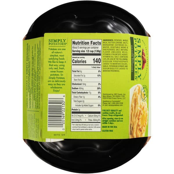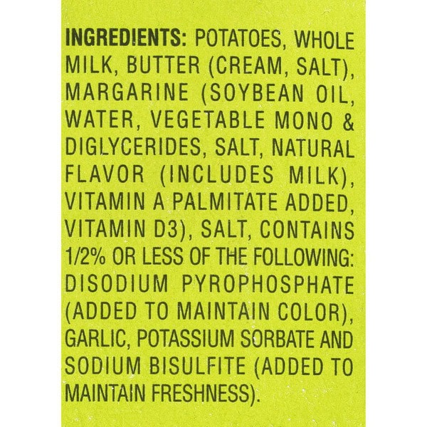 Potatoes, Whole Milk, Butter (cream, Salt), Margarine (liquid And Hydrogenated Soybean Oil, Water, Salt, Contains Less Than 2% Of Whey Solids, Vegetable Mono & Diglycerides, Soy Lecithin, Sodium Benzoate (preservative)), Salt, Contains 1/2% Or Less Of The Following: Disodium Pyrophosphate (added To Maintain Color), Garlic, Potassium Sorbate And Sodium Bisulfite (added To Maintain Freshness).