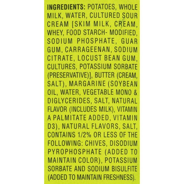 Potatoes, Whole Milk, Water, Cultured Sour Cream (skim Milk, Cream, Whey, Food Starch Modified, Sodium Phosphate, Guar Gum, Carrageenan, Sodium Citrate, Potassium Sorbate (a Preservative), And Locust Bean Gum), Butter (cream, Salt), Margarine (soybean Oil, Water, Vegetable Mono & Diglycerides, Salt, Natural Flavor (includes Milk), Vitamin A Palmitate Added, Vitamin D3), Natural Flavors, Salt, Contains 1/2% Or Less Of The Following: Chives, Disodium Pyrophosphate (added To Maintain Color), Potassium Sorbate And Sodium Bisulfite (added To Maintain Freshness)
