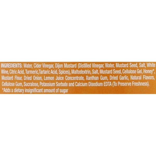 Water, Cider Vinegar, Dijon Mustard (distilled Vinegar, Water, Mustard Seed, Salt, White Wine, Citric Acid, Turmeric, Tartaric Acid, Spices), Maltodextrin, Mustard Seed, Salt, Cellulose Gel, Honey, Mustard Flour, Dried Onion, Lemon Juice Concentrate, Xanthan Gum, Granulated Garlic, Natural Flavors, Cellulose Gum, Sucralose, Potassium Sorbate And Calcium Disodium Edta (to Preserve Freshness).