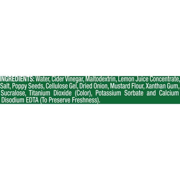 Water, Cider Vinegar, Maltodextrin, Lemon Juice Concentrate, Salt, Poppy Seeds, Cellulose Gel, Dried Onion, Mustard Flour, Xanthan Gum, Cellulose Gum, Sucralose, Potassium Sorbate And Calcium Disodium Edta (to Preserve Freshness), Titanium Dioxide Color).