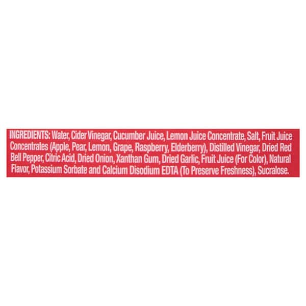 Water, Cider Vinegar, Cucumber Juice, Lemon Juice Concentrate, Salt, Fruit Juice Concentrates (apple Juice, Pear Juice, Clarified Lemon Juice, Elderberry Juice, Raspberry Juice), Distilled Vinegar, Dried Red Bell Peppers, Xanthan Gum, Citric Acid, Dried Onion, Dried Garlic, Fruit Juice (for Color), Natural Flavor, Potassium Sorbate And Calcium Disodium Edta (to Preserve Freshness), Sucralose, Grape Skin Extract(for Color).