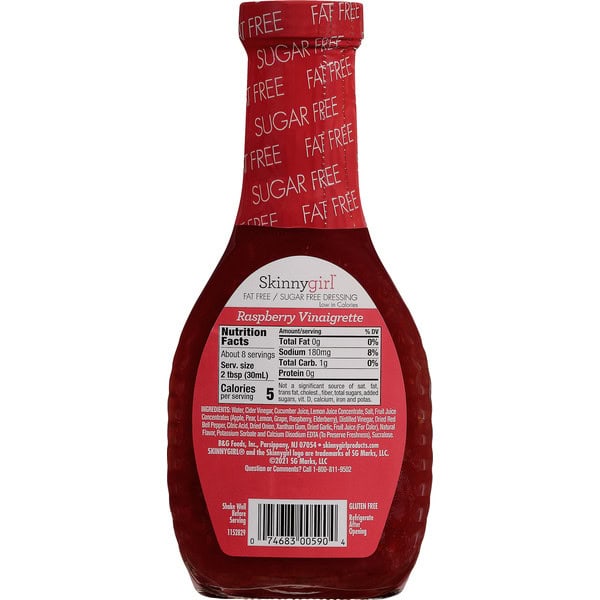 Skinnygirl Raspberry Vinaigrette dressing offers a great tasting salad dressing that finally lets you have it all. This Skinnygirl salad dressing combines the sweetness of raspberry and the tanginess of vinegar with no sugar or fat so you can live a little, and love yourself for it. With five calories per serving, this sugar free dressing is certified vegan and can also be used as a dipping sauce or a marinade. Drizzle a colorful spring vegetable mix and a few walnuts with this raspberry vinaigrette dressing to create a fresh side dish, or add some grilled chicken to make it a meal that’s oh-so good. Shake this bottle of Skinnygirl dressing well before serving and keep it refrigerated until you are ready to enjoy. Skinnygirl is all about a balanced lifestyle with delicious products that help you celebrate the things you love. No guilt. No hassles. Serving size for this product is 2 tbsp (30 mL).
