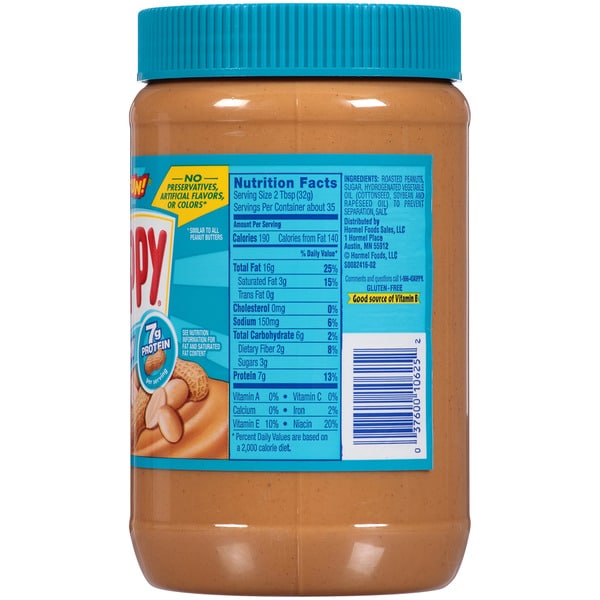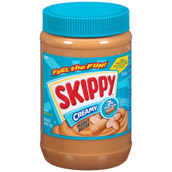 GO TO YOUR SKIPPY PLACE! With a hearty snack or a robust sandwich, SKIPPY Peanut Butter, Creamy, 7 g protein per serving, 40 oz Plastic Jar hits the spot with the right combination of sweet and savory peanut flavor. SKIPPY peanut butter makes nutritious delicious with foods like whole grain bread, fruit and milk – so spread the smiles! Our peanut butter helps restore energy and leaves you feeling charged. It’s been a staple on grocery lists and in pantries for over 80 years! Made with four simple ingredients, we only use real roasted peanuts with no added preservatives – no separation and no oily mess. There’s 7 grams of protein per serving; it’s great snacking with this smooth, creamy classic. Free from artificial flavors or colors, certified Kosher, gluten free and tree nut free. Try one of our many varieties: Chunky, Creamy, Reduced Fat, SUPER CHUNK spread and more. Since 1933, SKIPPY peanut butter has built trust and loyalty with peanut butter lovers. The SKIPPY brand continues to be the choice for peanut butter lovers’ lunchboxes, picnics, and kitchen tables everywhere. Includes one 40 oz plastic jar of SKIPPY Creamy Peanut Butter. All trademarks, logos and images are owned by Hormel Foods Corporation, its subsidiaries and affiliates. Copyright Hormel Foods, LLC.