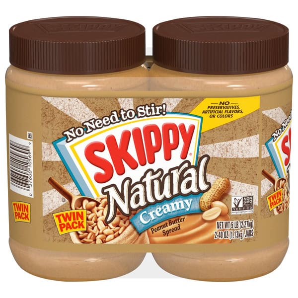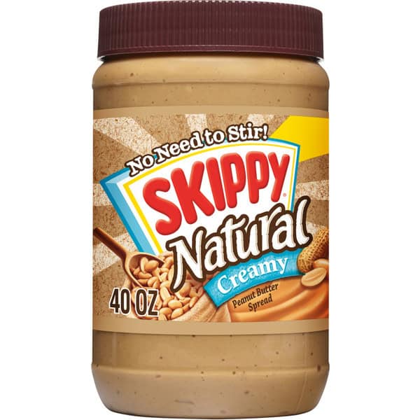 GO TO YOUR SKIPPY PLACE! An all-natural place made with real roasted peanuts, SKIPPY Natural Peanut Butter Spread that hits the spot with just the right combination of sweet and savory peanut flavor. SKIPPY Natural Creamy Peanut Butter spread makes nutritious delicious when combined with foods like whole grain bread, fruit and milk – so spread the smiles! Our peanut butter spread helps restore energy and leaves you feeling charged; no wonder it’s been a staple on grocery lists and in pantries for over 80 years! This 100% natural peanut butter spread has four simple ingredients; no added preservatives, no oily mess, no stirring! There’s 7 grams of protein and 0 grams trans-fat per serving; it’s great for hearty snacking or a robust sandwich. Free from artificial flavors or colors, certified Kosher, gluten free and tree nut free, it’s creamy peanut buttery perfection! Try one of our many varieties: Chunky, Reduced Fat, SUPER CHUNK spread and more. Since 1933, the makers of SKIPPY Peanut Butter has built trust and loyalty with peanut butter lovers. The SKIPPY brand continues to be the choice for peanut butter lovers, providing peanutty fun for lunchboxes, picnics, and kitchen tables everywhere. Includes one 40 oz. plastic jar of SKIPPY Natural Creamy Peanut Butter spread. All trademarks, logos and images are owned by Hormel Foods Corporation, its subsidiaries and affiliates. Copyright Hormel Foods, LLC.