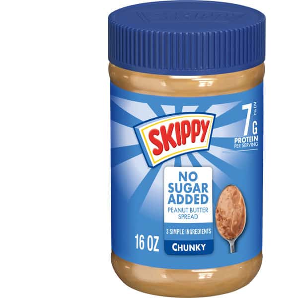 GO TO YOUR SKIPPY PLACE! Our SKIPPY Chunky Peanut Butter Spread No Sugar Added makes every snack heartier and every sandwich more robust with loads of real peanut pieces! It’s the taste that packs a crunch, SKIPPY Peanut Butter spread hits the spot with just the right combination of sweet and savory peanut flavor. SKIPPY Peanut Butter spread makes nutritious delicious when combined with foods like whole grain bread, fruit and milk – so spread the smiles! Our peanut butter spread helps restore energy and leaves you feeling charged; no wonder it’s been a staple on grocery lists and in pantries for over 80 years! We only use real roasted peanuts with no added preservatives – no separation and no oily mess. You get 7 grams of protein and 0 grams trans-fat per serving, so it’s great snacking with this smooth, chunky classic. Free from artificial flavors or colors, certified Kosher, gluten free, GMO free and tree nut free, it’s creamy peanut buttery perfection! Try them all: Chunky, Creamy, Reduced Fat spread and more. Since 1933, the makers of SKIPPY brand continue to be the choice for peanut butter lovers, providing peanutty fun for lunchboxes, picnics, and kitchen tables everywhere. Includes one 16 oz plastic jar of SKIPPY Chunky Peanut Butter Spread. All trademarks, logos and images are owned by Hormel Foods Corporation, its subsidiaries and affiliates. Copyright Hormel Foods, LLC.