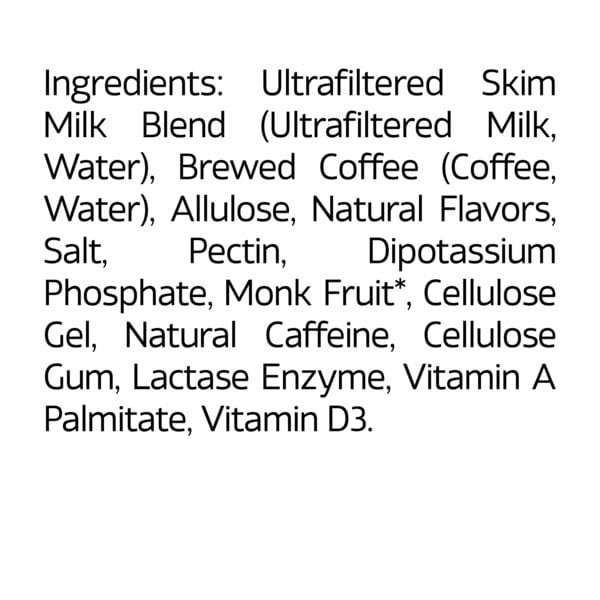 Brewed Coffee (water, Coffee), Ultrafiltered Skim Milk, Less Than 2% Of Natural Flavors, Salt, Pectin, Dipotassium Phosphate, Cellulose Gel, Cellulose Gum, Natural Caffeine, Monk Fruit*, Stevia Leaf (reb M), Lactase Enzyme, Vitamin A Palmitate, Vitamin D3, *adds An Insignificant Amount Of Sugar