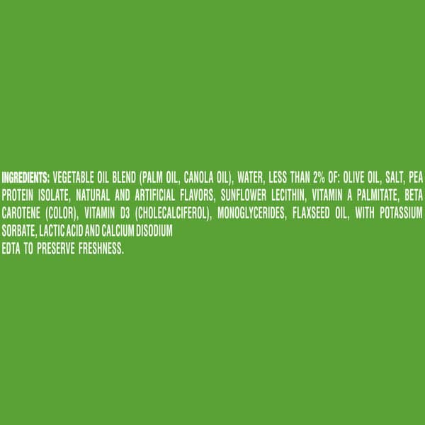Vegetable Oil Blend (canola, Palm, And Olive Oils), Water, Contains Less Than 2% Of Salt, Pea Protein, Natural And Artificial Flavors, Sunflower Lecithin, Vitamin A Palmitate, Beta-carotene (color), Vitamin D, Monoglycerides Of Vegetable Fatty Acids (emulsifier); And Potassium Sorbate, Lactic Acid, Calcium Disodium Edta (to Preserve Freshness).