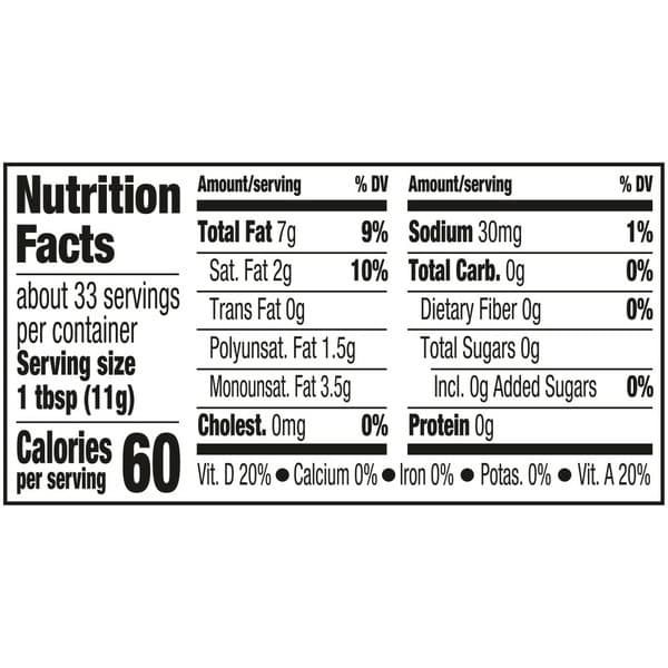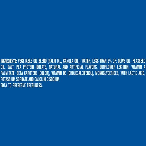 Oil Blend (canola, Palm, Olive, And Soybean Oils), Water, Less Than 2 Percent Of Salt, Pea Protein, Natural And Artificial Flavors, Sunflower Lecithin, Vitamin A Palmitate, Vitamin D, Beta-carotene Color, Monoglycerider Of Vegetable Fatty Acids (emulsifier), Potassium Sorbate, Lactic Acid, Calcium Disodium Edta (to Preserve Freshness).