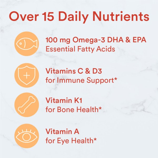 • With Over 15 Nutrients to Support Growing Bodies: Our science-backed formula includes vitamins B12, A, E, K1 and iodine, as well as Omega-3 EPA & DHA, meaning you get more benefits from our kids chewable multivitamins in each serving