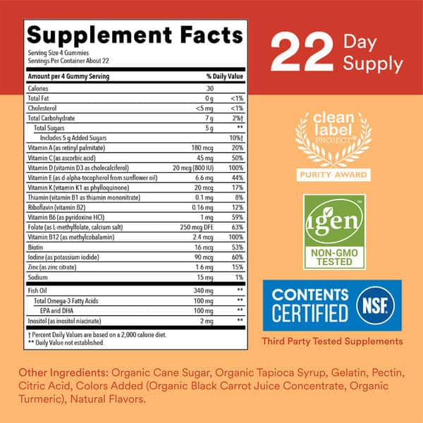 • Better Nutrient Sources: We include bioavailable forms of high-quality nutrients that are easier for your kids’ bodies to absorb like methylated folate, vitamin B12 as methylcobalamin, D3, and zinc citrate