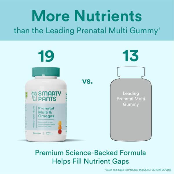 • Premium, Science-Backed Prenatal Gummy Multivitamin: SmartyPants Prenatal Multi & Omegas contains more nutrients than the leading prenatal multi gummy* and is specifically formulated to fill nutritional gaps in the average diet (*Based on $ Sales, IRI InfoScan, and MULO, 05/2022-05/2023)