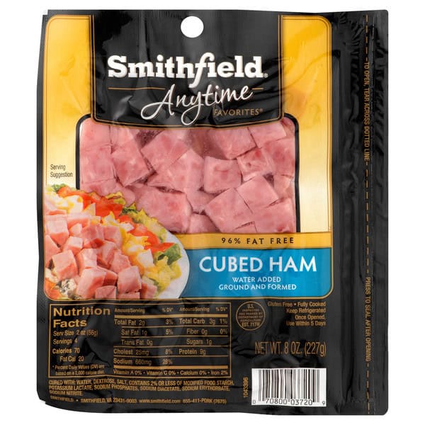 Smithfield Anytime Favorites Cubed Ham is is cubed into bite-size pieces that are an ideal addition to a variety of dishes. This delicious boneless ham is 96% fat free for a leaner pork option. Each serving of low fat ham provides 9 grams of protein. Pre-cooked for convenient preparation, these quality ready to eat ham pieces add texture and classic Smithfield flavor to every bite. Use this delicious fully cooked cubed ham as a flavorful topping on salads, pizzas or pasta dishes, or incorporate it into family meals such as a breakfast quiche, your signature ham salad, casseroles, pasta salads and soups. For convenient storage and optimal freshness, this Smithfield fully cooked ham comes in an easy-to-open package with a resealable closure. For best quality, keep this deli cubed ham refrigerated until ready to use.