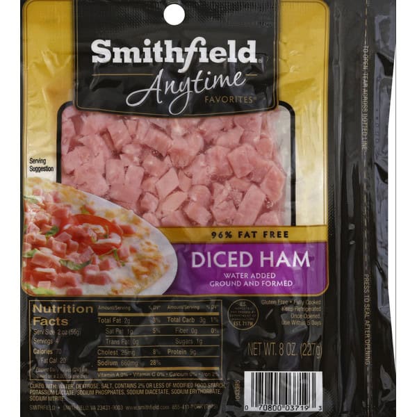 Gluten free food. 96% fat free. Water added. Ground and formed. Fully cooked. US inspected and passed by Department of Agriculture. www.smithfield.com. 855-411-Pork (7675).