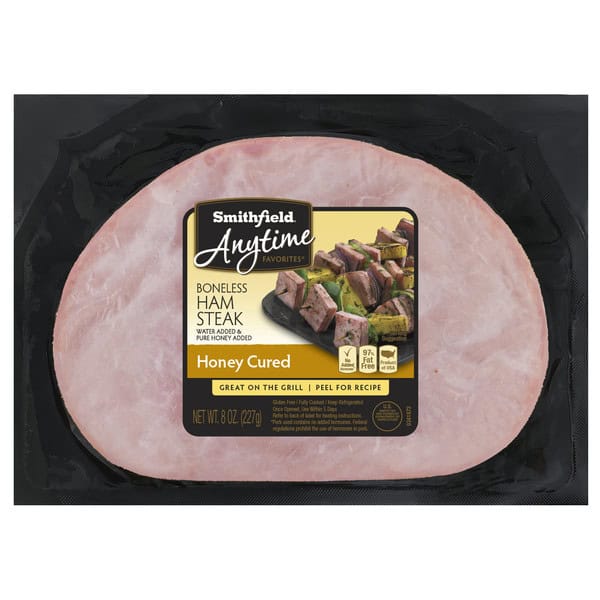Smithfield Anytime Favorites Honey Cured Boneless Ham Steak offers delicious ham in convenient, perfectly sized portions, so you can have ham with any meal. Enjoy all the flavor with the benefit of a lean protein with this 97% fat free ham steak. This fully cooked ham steak is boneless and conveniently ready to enjoy with less prep for everyday meals or special occasions. It comes perfectly portioned in an 8 ounce piece. The addition of pure honey intensifies the sweet, flavorful taste in each bite. Enjoy honey cured ham steak next to your eggs and toast for a filling breakfast to start your day, or serve up a hearty lunch or family dinner with ham steak slices and potatoes. Dice up this cured honey ham steak to add the sweet, rich flavor to casseroles, potato dishes or scrambled eggs. Smithfield Anytime Favorites Honey Cured Boneless Ham Steak comes sealed in packaging to keep it fresh in your refrigerator, where it’s always ready for your favorite ham steak recipes.