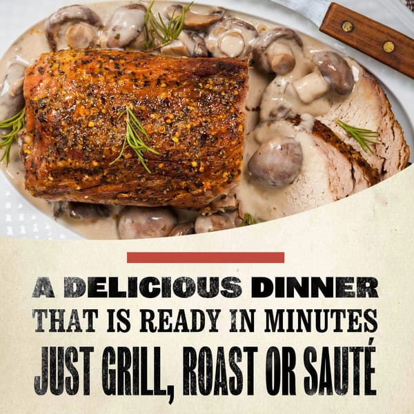 • This whole boneless pork loin features the savory taste of portobello mushroom