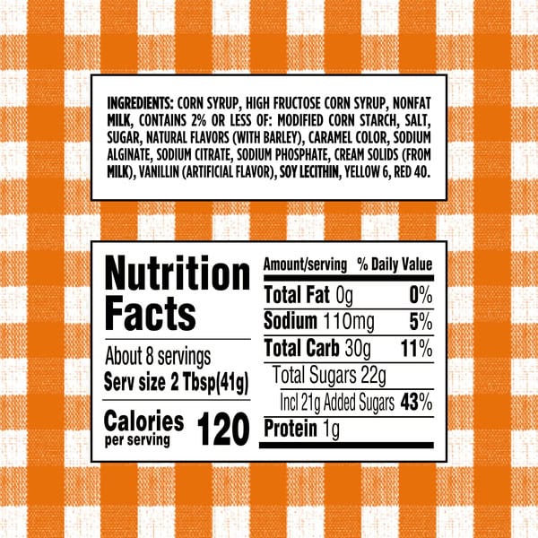 Corn Syrup, High Fructose Corn Syrup, Nonfat Milk, Contains 2% Or Less Of: Modified Corn Starch, Salt, Sugar, Natural Flavors (with Barley), Caramel Color, Sodium Alginate, Sodium Citrate, Sodium Phosphate, Cream Solids (from Milk, Vanillin (artificial Flavor), Soy Lecithin, Yellow 6, Red 40
