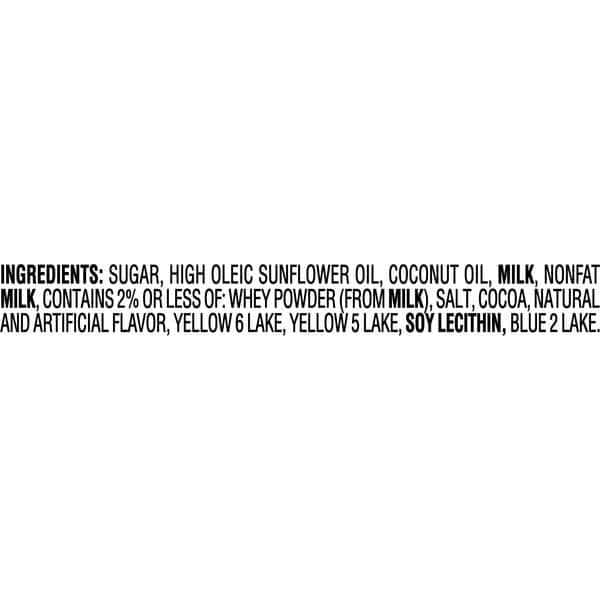 Sugar, Sunflower Oil, Coconut Oil, Milk, Nonfat Milk, Contains 2% Or Less Of: Reduced Mineral Whey, Cocoa, Soy Lecithin, Salt, Natural And Artificial Flavor, Yellow 6 Lake, Yellow 5 Lake, Blue 2 Lake,