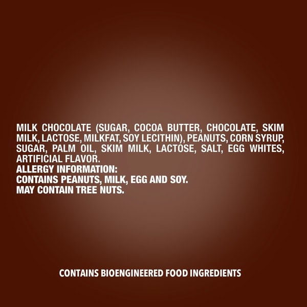 Milk Chocolate (sugar, Cocoa Butter, Chocolate, Skim Milk, Lactose, Milkfat, Soy Lecithin), Peanuts, Corn Syrup, Sugar, Palm Oil, Skim Milk, Lactose, Salt, Egg Whites, Artificial Flavor.