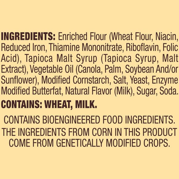 Enriched Flour (wheat Flour, Niacin, Reduced Iron, Thiamine Mononitrate, Riboflavin, Folic Acid), Tapioca Malt Syrup (tapioca Syrup, Malt Extract), Canola Oil, Salt, Maltodextrin, Modified Cornstarch, Yeast, Enzyme Modified Butterfat (milk), Natural Flavoring, Sugar, Soda
