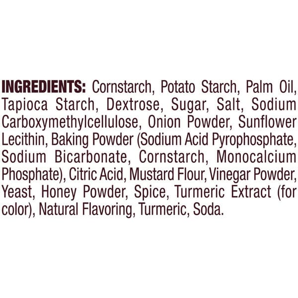 Cornstarch, Potato Starch, Palm Oil, Tapioca Starch, Dextrose, Sugar, Salt, Sodium Carboxymethylcellulose, Onion Powder, Sunflower Lecithin, Baking Powder (sodium Acid Pyrophosphate, Sodium Bicarbonate, Cornstarch, Monocalcium Phosphate), Citric Acid, Mustard Flour, Vinegar Powder, Yeast, Honey Powder, Spice, Turmeric Extract (for Color), Natural Flavoring, Turmeric, Soda