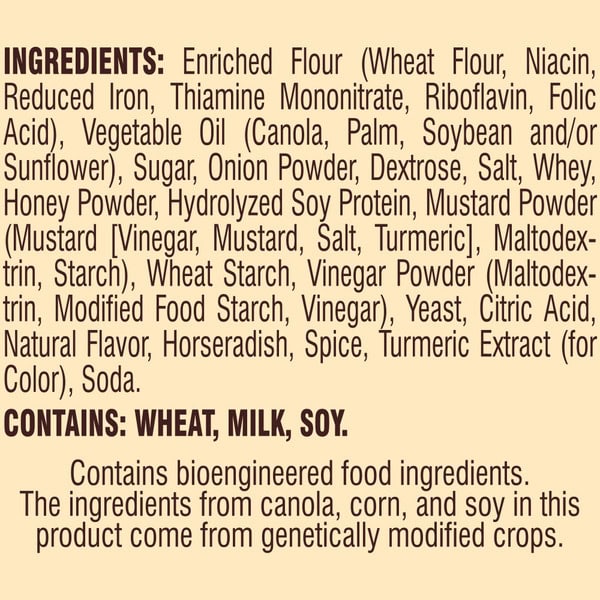 Enriched Flour (wheat Flour, Niacin, Reduced Iron, Thiamine Mononitrate, Riboflavin, Folic Acid), Palm Oil, Sugar, Onion Powder, Dextrose, Salt, Whey (milk), Honey Powder, Hydrolyzed Soy Protein, Mustard Powder (mustard [vinegar, Mustard, Salt, Turmeric], Maltodextrin, Starch), Wheat Starch, Vinegar Powder (maltodextrin, Modified Food Starch, Vinegar), Yeast, Canola Oil, Citric Acid, Natural Flavor, Horseradish, Spice, Turmeric Extract (color), Soda