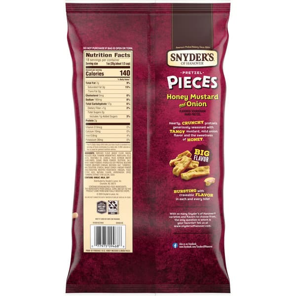 Snyder’s of Hanover Honey Mustard and Onion Pretzel Pieces are bursting with craveable flavor in every bite! Enjoy crunchy sourdough pretzels, generously seasoned with tangy mustard, mild onion flavor, and the sweetness of honey. You’ll love the crunch, hearty satisfaction, and bold flavor found in every bite. Our pretzel pieces are the perfect snack to crunch on during game day or as a lunchtime side. Snyder’s of Hanover has been America’s Pretzel Bakery since 1909, and our pretzels give you that delicious crunch for the perfect snack! Made in a facility that does not process peanuts, Snyder’s pretzels are made from wholesome ingredients, kneaded, and oven baked to seal in all the flavor. Snyder’s of Hanover pretzels have been shared across tables, across generations, and across the country, making us America’s favorite pretzel brand. There’s nothing like the bold flavor of honey mustard and onion, and with a 18-oz. Party Size bag, it’s easy to feed your craving any time.