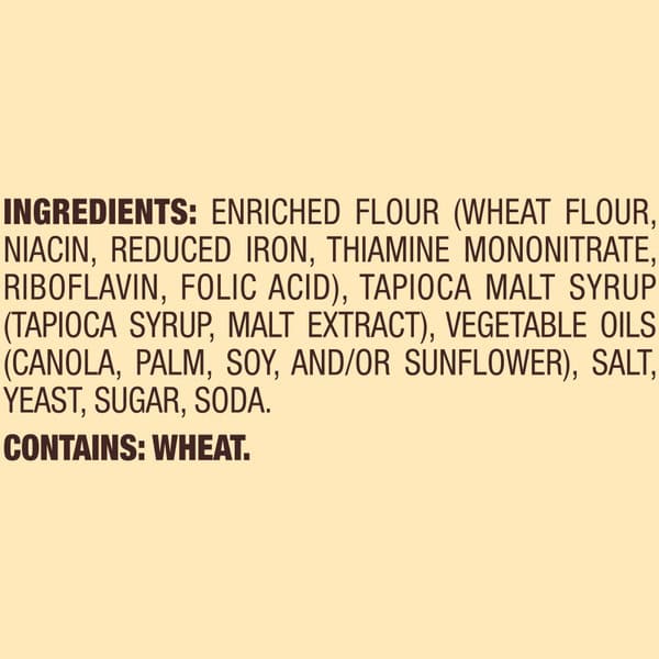Enriched Flour (wheat Flour, Niacin, Reduced Iron, Thiamine Mononitrate, Riboflavin, Folic Acid), Tapioca Malt Syrup (tapioca Syrup, Malt Extract), Canola Oil, Salt, Yeast, Sugar, Soda