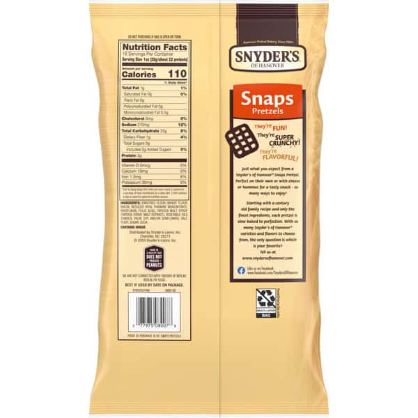 Snyder’s of Hanover Snaps Pretzels deliver the rich, hearty flavor of traditional pretzels in a crunchy, checkerboard shape. They’re perfect for snacking, stacking, sandwiching and scooping. You’ll love this delightfully versatile snack with only 1 gram of fat per serving. Plus, they’re made in a facility that does not process peanuts so they’re the perfect school snack. Snyder’s of Hanover has been America’s Pretzel Bakery since 1909 and our pretzels give you that delicious crunch for the perfect anytime snack! Snyder’s of Hanover pretzels are kneaded and oven-baked to seal in all the flavor. Snyder’s of Hanover pretzels have been shared across tables, across generations and across the country, making us America’s favorite pretzel brand. This 16-ounce Family Size Bag of Snyder’s Snaps Pretzels has plenty for sharing with friends and family. Feed all your cravings with Snyder’s pretzel snacks.