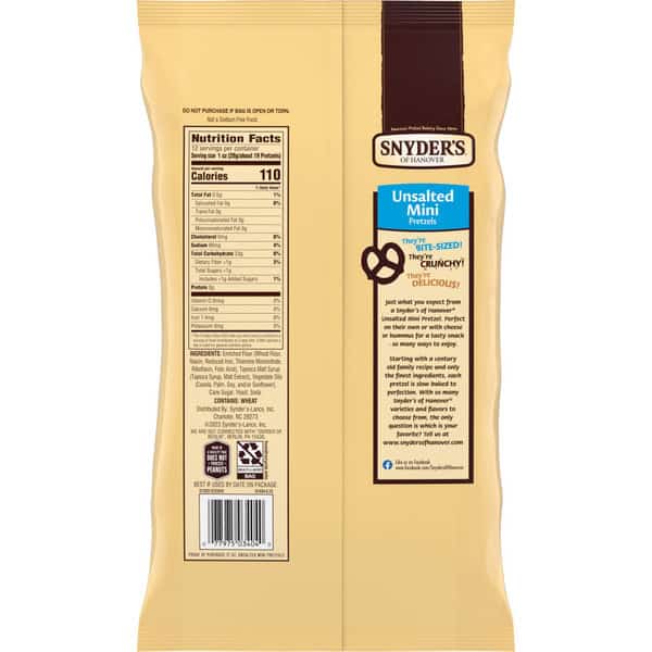 Snyder’s of Hanover Unsalted Mini Pretzels offer the delicious flavor of traditional pretzels with less sodium. This irresistible bite-size snack gives you all the delicious enjoyment and crunch you crave. Everyone can feel good about enjoying this Non-GMO Project Verified snack, which is made in a facility that doesn’t process peanuts. That makes them ideal for school, lunch, sports and on the go. These unsalted mini pretzels are the great for snackers of all ages! Snyder’s has been America’s Pretzel Bakery since 1909 – that’s how we perfected that one-of-a-kind flavor and crunch. Snyder’s pretzels are created from quality ingredients, kneaded, and oven-baked to seal in all the goodness. It’s no wonder our snacks have been shared across tables, between generations, from one end of the country to the other – making us America’s favorite pretzel brand. This 12-ounce bag of pretzels is ideal for snacking alone or with friends. Feed all your flavor cravings. Start munching Snyder’s pretzel snacks. Go ahead, make some noise!