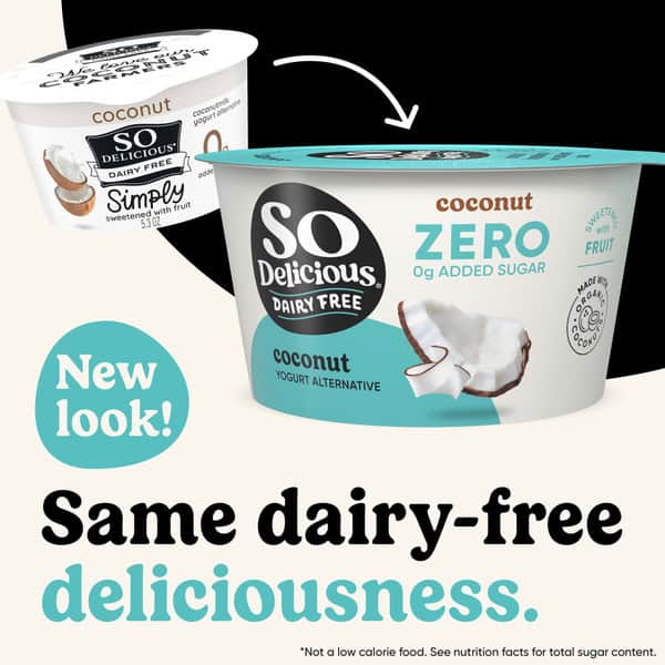 Deliciousness awaits in every spoonful of So Delicious Dairy Free 0g Added Sugar Coconut Coconutmilk Yogurt Alternative. Treat yourself to a moment of bliss with the sweetness of classic coconut flavor. Our vegan yogurt alternative is made with thoughtfully-sourced ingredients, including organic coconut. Every spoonful is simply sweetened with fruit and contains 0g of added sugar, including no artificial sweeteners or flavors. You won’t find any dairy, lactose, soy or gluten here. Plus, every serving of these dairy free snacks has live and active cultures. This plant based yogurt alternative makes it easy to enjoy any time of day. Indulge your taste buds and add a sprinkle of granola to this non dairy yogurt alternative. Or layer it with your favorite diced fruits for a gluten free yogurt alternative at breakfast or dessert. So Delicious is a brand of Danone North America, a Certified B Corp, joining people using business as a force for good. Meet the masterfully blended line of So Delicious Dairy Free Yogurt Alternatives and try all the flavors! They’re Certified Vegan and verified by the Non-GMO Project. Find your deliciousness with So Delicious Dairy Free 0g Added Sugar Coconut Coconutmilk Yogurt Alternative.