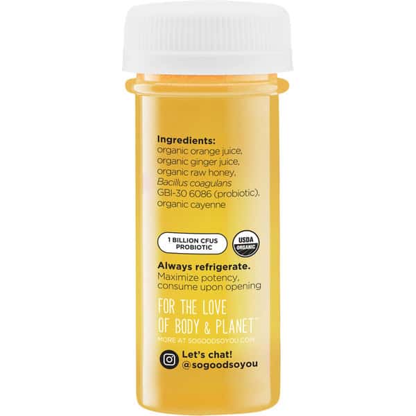 Ingredientsorganic orange juice, organic ginger juice, organic raw honey, Bacillus coagulans GBI-30 6086 (probiotic), organic cayenne pepper