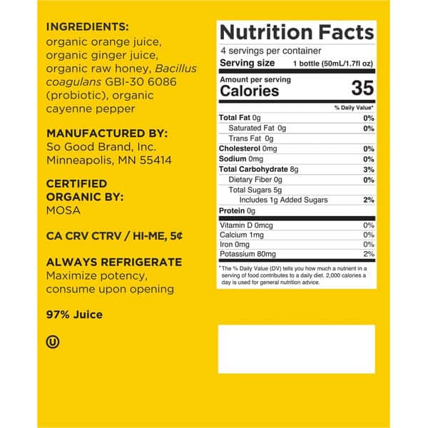 organic orange juice, organic ginger juice, organic raw honey, Bacillus coagulans GBI-30 6086 (probiotic), organic cayenne pepper