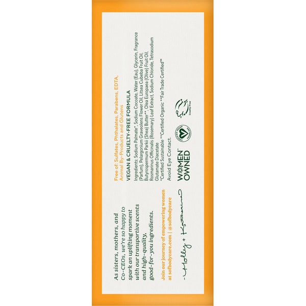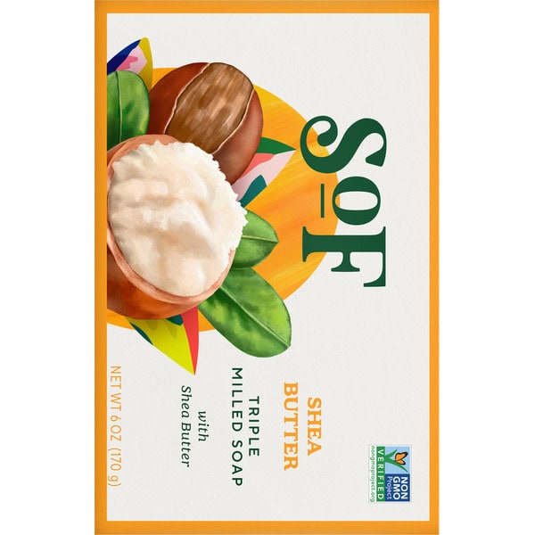 With organic shea butter. Certified GF Gluten Free. www.gf-finder.com. Certified Vegan. vegan.org. Non GMO Project verified. nongmoproject.org. Natural body care. Our luxuriously lathering all-vegetable soap is triple-milled in the Marseille tradition for a pampering cleansing experience. Hydrating Coconut Oil and sustainable Palm Oil create a creamy lather; nourishing Glycerin combines with organic Shea Butter to leave your skin soft and moisturized. Infused with the aroma of shea butter just unloaded onto the bustling docks of the port of Marseille. Free of phthalates, sulfates, parabens, EDTA, animal by-products and colorants. Family owned and operated. www.southoffrancebodycare.com. Women Owned. Family owned and operated. Cruelty-Free. FSC: Mix packaging.