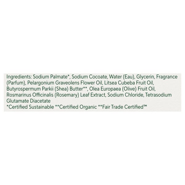 Sodium Palmate*, Sodium Cocoate, Water, Glycerin, Fragrance, Pelargonium Graveolens Flower Oil, Litsea Cubeba Fruit Oil, Butyrospermum Parkii (shea) Butter**, Olea Europaea (olive) Fruit Oil, Rosmarinus Officinalis (rosemary) Leaf Extract, Sodium Chloride, Tetrasodium Glutamate Diacetate, *certified Sustainable, **certified Organic, **fair Trade Certifiedâ„¢