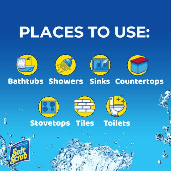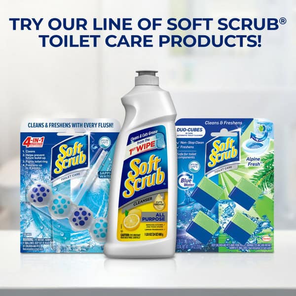 Soft Scrub All Purpose Cleanser has an improved formula now packs even more cleaning punch in a faster and easier to rinse formula! It’s perfect for powerful cleaning on sinks, showers, and toilets and removing tough stains from bathroom and kitchen surfaces. It leaves behind a fresh lemon scent once you’re done cleaning. This product is Orthodox Union certified Kosher. Soft Scrub Total All Purpose Bath & Kitchen Cleanser cleans surfaces in the bathroom, kitchen and throughout the house. It removes soap scum, hard water stains, limescale, grease, grime, and food stains, and is safe to use on stainless steel, chrome, granite, porcelain, ceramic, plastic laminate, and glass-top stoves. This package includes one 24 ounce bottle of Soft Scrub All Purpose Cleanser in lemon scent.