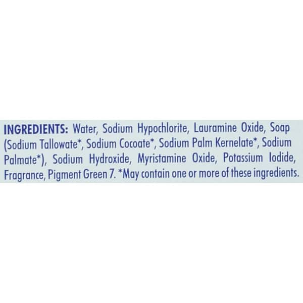 Water, Sodium Hypochlorite, Lauramine Oxide, Soap (sodium Tallowate*, Sodium Cocoate*, Sodium Palm Kernelate*, Sodium Palmate*), Sodium Hydroxide, Myristamine Oxide, Potassium Iodide, Fragrance, Pigment Green 7, *may Contain One Of More Of These Ingredients