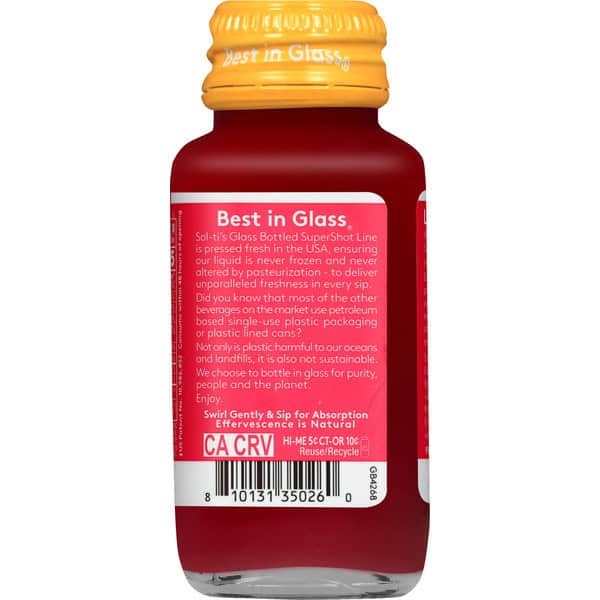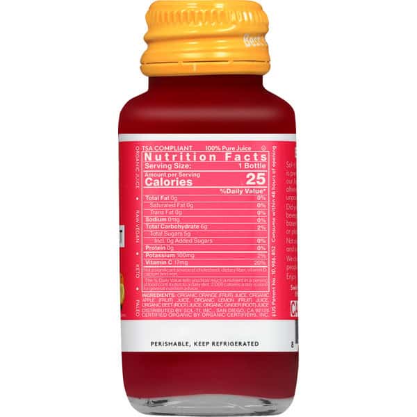 • SPORTS RECOVERY & CIRCULATION SUPPORT: One (1) 2.1 oz bottle of Sol-ti® GINGER BEET SuperShot®, featuring 7800mg of organic beet root and 4500mg of organic ginger, paired with zesty lemon and orange for a refreshing, functional boost.