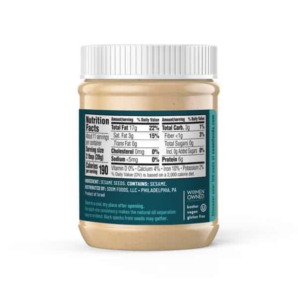 Creamy and silky-smooth, Soom Tahini is made from 100% roasted and ground premium sesame seeds. The mild nutty flavor makes this nutritious pantry staple perfect for both savory and sweet recipes.