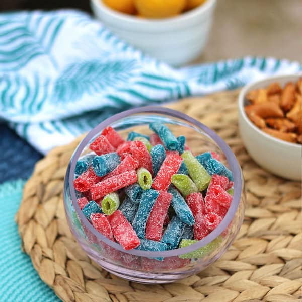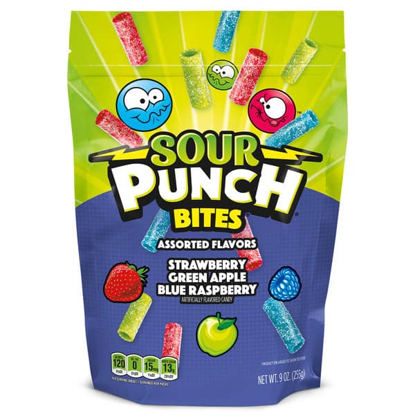 Each bag holds about 9 servings of Sour Punch Bites®, the perfect for pairing for popcorn on movie night. This assortment of classic Sour Punch ® candy will never let you down, with mouthwatering Blue Raspberry, Apple & Strawberry fruit flavors in each bag. Each soft & chewy sugar coated candy bite is bursting flavor! Experience the mouthwatering thrill of SOUR PUNCH® Bites® in Assorted fruit candy flavors. Mix & match 3 sour candy flavor favorites: Apple, Blue Raspberry, Strawberry. Resealable bag makes for deliciously soft & chewy candy with each bite. Approximately 9 servings (90 pieces) per 9oz bag & only 120 calories per serving. SOUR PUNCH candy is always low fat, low sodium and Kosher & Halal certified.