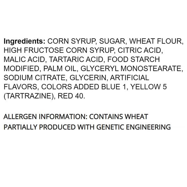 Corn Syrup, Sugar, Wheat Flour, High Fructose Corn Syrup, Citric Acid, Malic Acid, Tartaric Acid, Food Starch Modified, Palm Oil, Glyceryl Monostearate, Sodium Citrate, Glycerin, Artificial Flavors, Colors Added Blue 1, Yellow 5 (tartrazine), Red 40