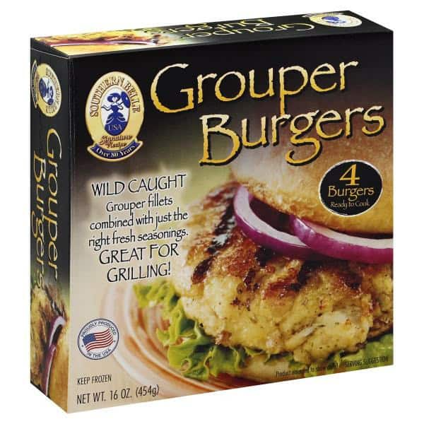 Keep frozen. For Food Safety and Quality: Cook to a uniform internal temperature of 165 degrees F. Ovens and wattages vary. Adjust cooking times as needed. Product must be cooked thoroughly. Read and follow these cooking instructions. Bake: Preheat oven to 400 degrees F. Place frozen burgers on a greased baking sheet. Brush with melted butter or olive oil (optional). Cook on center rack of oven 20-25 minutes. Pan Fry: Preheat a saute pan over low-medium heat. Add 1 tablespoon of extra virgin olive oil. Place frozen Grouper Burgers in a pan and cook for approximately 14 minutes, turning frequently to insure even cooking. Indoor Electric Tabletop Grill: Preheat grill and brush with extra virgin olive oil. Place frozen Grouper Burgers on grill. Cook for 10 minutes with lid down until browned and temperature achieved. Turn several times throughout the cooking process to insure even cooking. Outdoor Grill: Brush oil or butter on the frozen burgers. Preheat grill to medium high. Cook 7-10 minutes per side, until browned and temperature achieved.