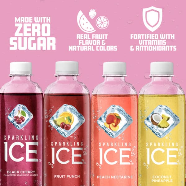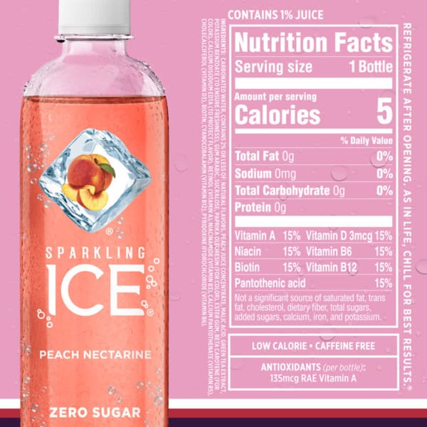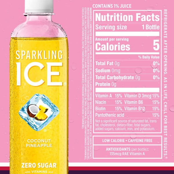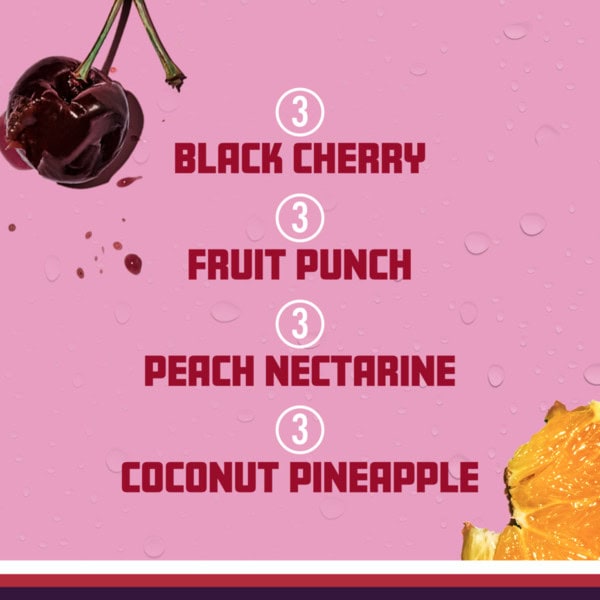 3 – Black Cherry Ingredients: Carbonated Water, Malic Acid, Fruit And Vegetable Juice (for Color), Natural Flavors, Potassium Benzoate (to Ensure Freshness), Citric Acid, Sucralose, Green Tea Extract, Cherry Juice Concentrate, Biotin, Niacinamide (vitamin B3), Vitamin A, Calcium Pantothenate (vitamin B5), Vitamin B12, Vitamin D3, Pyridoxine Hydrochloride (vitamin B6). 3 – Peach Nectarine Ingredients: Carbonated Water, Malic Acid, Peach Juice Concentrate, Natural Flavors, Potassium Benzoate (to Ensure Freshness), Gum Arabic, Paprika Oleoresin (for Color), Sucralose, Ester Gum, Beta Carotene (for Color), Green Tea Extract, Calcium Disodium Edta (to Protect Flavor), Biotin, Niacinamide (vitamin B3), Vitamin A, Calcium Pantothenate (vitamin B5), Vitamin B12, Vitamin D3, Pyridoxine Hydrochloride (vitamin B6). 3 – Pink Grapefruit Ingredients: Carbonated Water, Citric Acid, Grapefruit Juice Concentrate, Natural Flavors, Potassium Benzoate (to Ensure Freshness), Gum Arabic, Sucralose, Vegetable Juice (for Color), Ester Gum, Green Tea Extract, Calcium Disodium Edta (to Protect Flavor), Biotin, Niacinamide (vitamin B3), Beta Carotene (for Color), Vitamin A, Calcium Pantothenate (vitamin B5), Vitamin B12, Vitamin D3, Pyridoxine Hydrochloride (vitamin B6). 3 – Coconut Pineapple Ingredients: Carbonated Water, Malic Acid, Natural Flavors, Coconut Water Concentrate, Potassium Benzoate (to Ensure Freshness), Indian Gooseberry Extract (to Stabilize Color), Sucralose, Ester Gum, Beta Carotene (for Color), Green Tea Extract, Calcium Disodium Edta (to Protect Flavor), Biotin, Niacinamide (vitamin B3), Calcium Pantothenate (vitamin B5), Vitamin B12, Vitamin A, Vitamin D3, Pyridoxine Hydrochloride (vitamin B6).