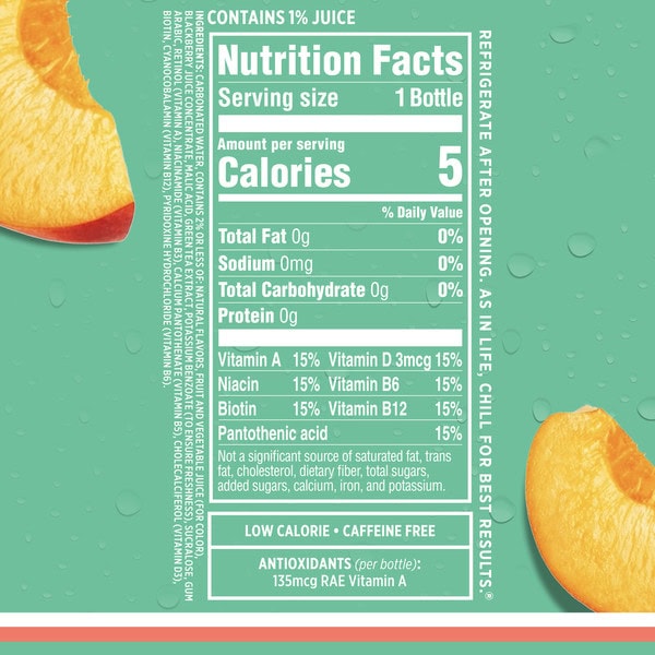 Carbonated Water, Contains 2% Or Less Of: Peach Juice Concentrate, Beta Carotene (for Color), Paprika Oleoresin (for Color), Natural Flavors, Green Tea Extract, D-alpha-tocopherol Acetate (vitamin E), Niacinamide (vitamin B3), Calcium Pantothenate (vitamin B5), Pyridoxine Hydrochloride (vitamin B6), Biotin, Cyanocobalamin (vitamin B12), Sucralose, Citric Acid, Tartaric Acid, Gum Arabic, Ester Gum, Calcium Disodium Edta (to Protect Flavor), Potassium Benzoate (to Ensure Freshness)