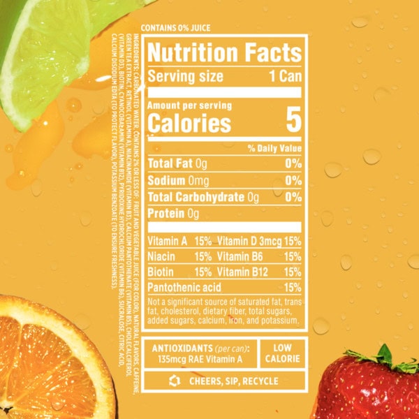 Carbonated Water, Natural Flavors, Citric Acid, Vegetable Juice (for Color), Potassium Benzoate (to Ensure Freshness), Sucralose, Caffeine, Green Tea Extract, Calcium Disodium Edta (to Protect Flavor), Biotin, Niacinamide (vitamin B3), Vitamin A, Calcium Pantothenate (vitamin B5), Vitamin B12, Vitamin D3, Pyridoxine Hydrochloride (vitamin B6)