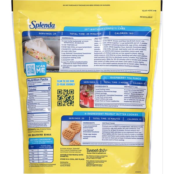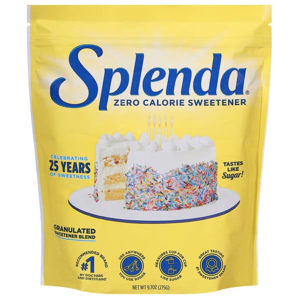 Splenda zero-calorie granulated sweetener is a perfect zero-calorie sugar alternative. Great for sweetening all of your favorite recipes like baked goods, glazes, dressings and drinks! Use it anywhere sugar is normally called for. It conveniently measures cup for cup like sugar, tastes like sugar, and has zero calories making it easy to use and substitute for sugar without sacrificing the sweet taste you love.
