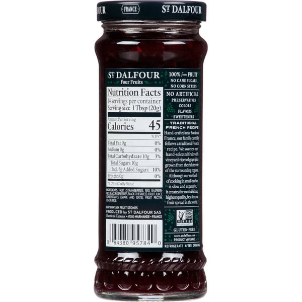 Sweetened only with vineyard-ripened grape and fruit juice concentrates. All natural. 100% fruit. Traditional French recipe. By gently cooking in the tradition of the French countryside, the natural flavor of the fruit is conserved. No preservative. No artificial flavors or colors. Non GMO Project verified. nongmoproject.org. Visit our website: www.stdalfour.us. Product of France.