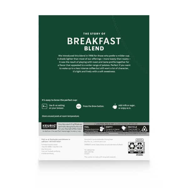 • 32-count K-Cup pods box of Breakfast Blend medium roasted coffee